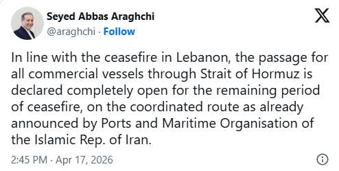“U skladu s primirjem u Libanonu, prolaz za sva komercijalna plovila kroz Hormuški moreuz proglašen je potpuno otvorenim za preostalo razdoblje primirja, na koordiniranoj ruti koju je već najavila Organizacija za luke i pomorstvo Islamske Republike Iran”, objavio je Araghchi.