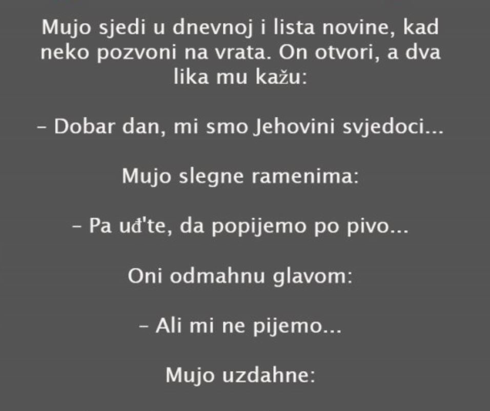 Jehovini svjedoci su oduvijek za nas bili polovično poznata tema. Znamo samo da imaju posebna religijska uvjerenja i da često imaju običaj da pozivaju ljude u svoju religiju tako što često ostavljaju brošure i letke, a nerijetko idu od vrata do vrata. Danas prenosimo jednu anegdotu vezanu za ovu temu a nakon toga donosimo još malo zanimljivosti o samim Jehovinim svjedocima.
