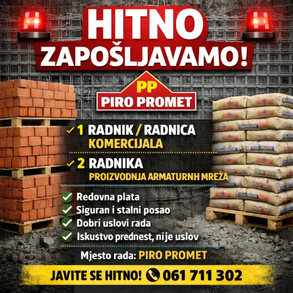 Tešanj, BiH – Kompanija Piro Promet Tešanj raspisala je oglas za zapošljavanje više radnika, u skladu s trenutnim potrebama poslovanja. Pozicije su otvorene za različite sektore, a prijave su dobrodošle svim zainteresiranim kandidatima.