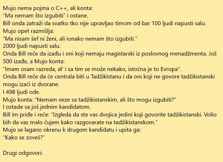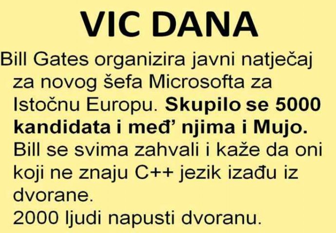 Microsoft je kompanija koja je jedna od najvećih i najpoznatijih na svijetu. Danas imam ojednu anegdotu o bosancu koji je odlučio da se prijavi na natječaj za radno mjesto u Microsoftu. Poznavajući mentalitet bosanaca, ovaj čovjek je odlučio da se posluži određenim trikovima prilikom same procedure kod selekcije novih uposlenika. Evo kako se to odigralo, priča je zanimljiva a nakon toga malo više zanimljivosti o samoj kompaniji Microsoft.